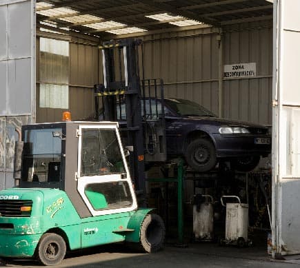 Cuando el vehículo entra en nuestras instalaciones, es depositado en la zona de recepción, y se procede a la descontaminación del mismo, quitando todos los residuos, tanto peligrosos como no peligrosos, recogiéndolos en contenedores específicos para cada residuo y enviándolos posteriormente a sus correspondientes gestores autorizados para su oportuno tratamiento, evitando así el coste medioambiental de un vehiculo al final de su vida útil.